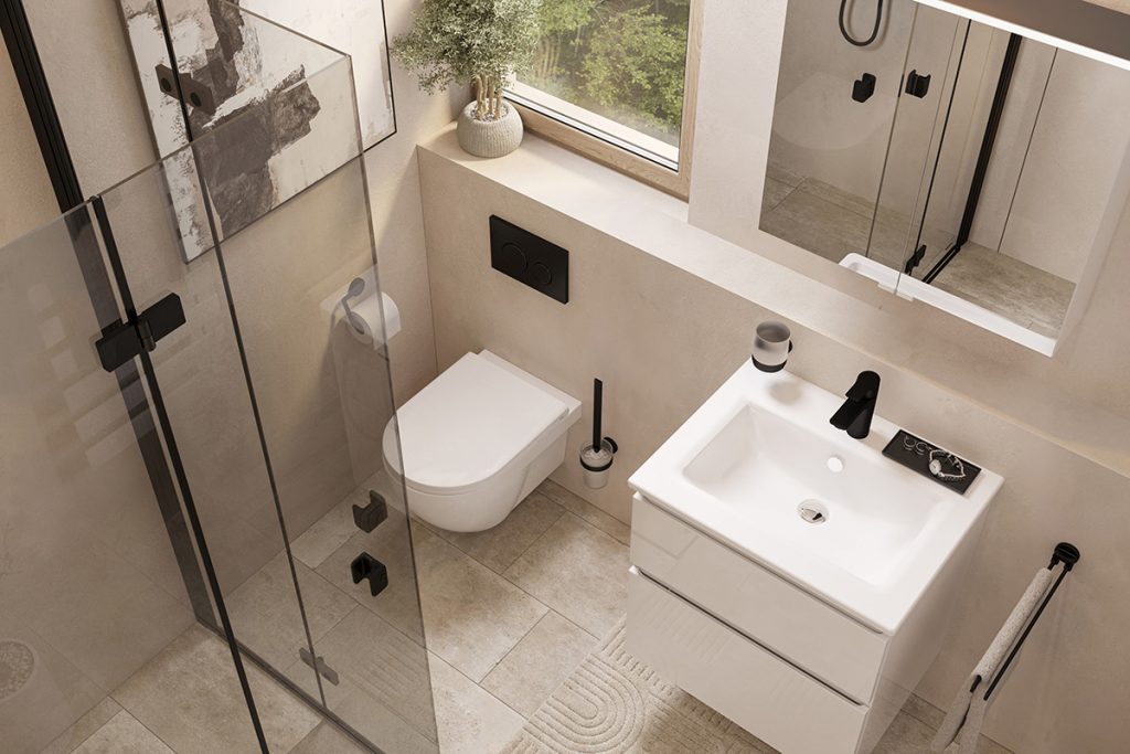 Auch auf wenigen Quadratmetern können Bäder entstehen, die sowohl praktisch als auch stilvoll sind. Helle Farben und Oberflächen lassen den Raum größer wirken und schaffen eine freundliche Atmosphäre, während schwarze Armaturen und Accessoires aus der Serie Optima L elegante Akzente setzen.